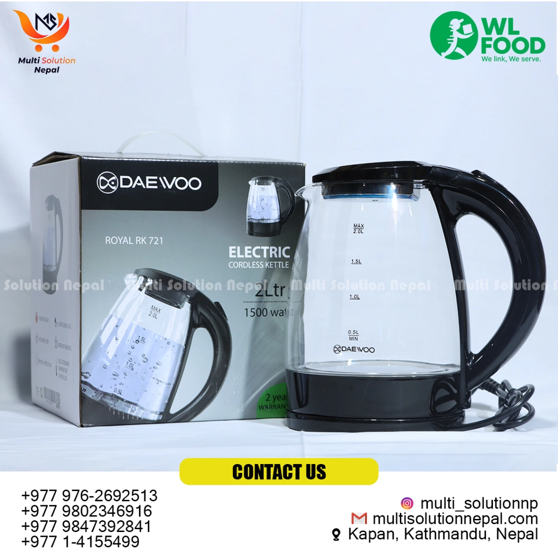 Boil smarter with Daewoo’s sleek and powerful ROYAL RK 721. This 2-liter cordless kettle delivers rapid heating with 1500 watts of power, perfect for tea, coffee, or instant meals. Its transparent body with water level markings ensures precision, while the cordless design offers easy portability and convenience.